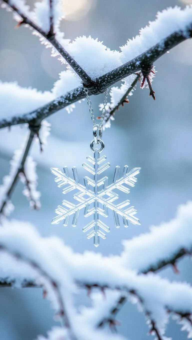 A snowflake-shaped crystal pendant, resting delicately on the frost-covered branches of a magical winter forest, glowing faintly with an ethereal inner light, casting soft, shimmering reflections on the icy twigs, surrounded by a serene, mysterious woodland.