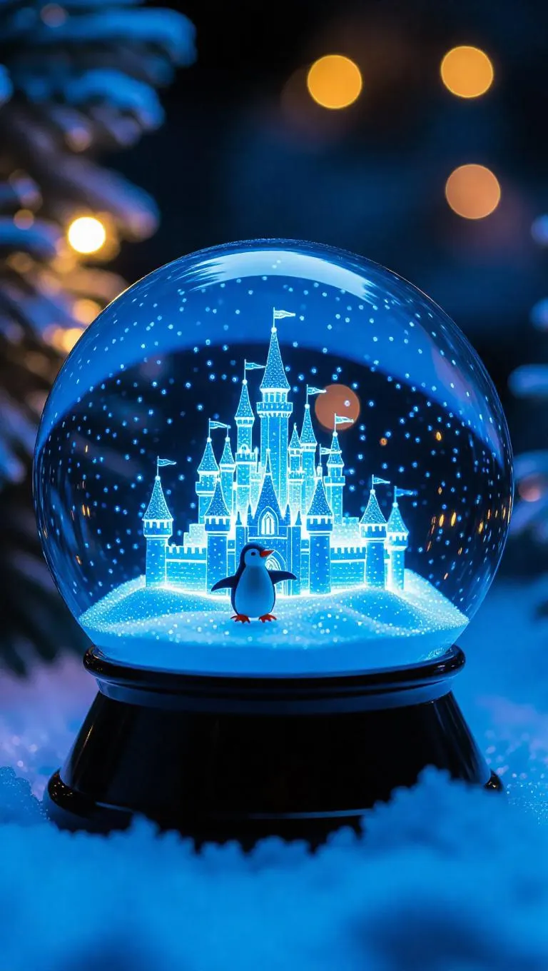 a small, glowing snow globe, illuminated by cool, bluish light. Inside, a miniature ice castle sparkles with exquisite details, surrounded by a flurry of tiny snowflakes, with a tiny penguin sliding across the snow, creating a joyful and enchanting arctic scene.
