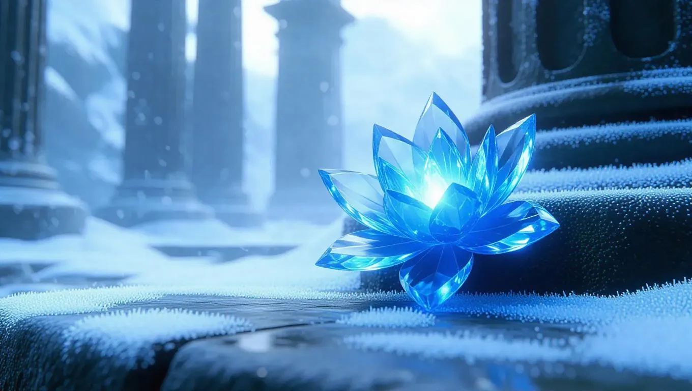 A single ethereal blue crystal flower emerging from a fissure in the icy ground, encircled by delicate, shimmering frost. The flower radiates a subtle glow, casting a magical aura over the frosty ruins of an ancient temple, where moss-covered pillars rise from the snow-covered floor.