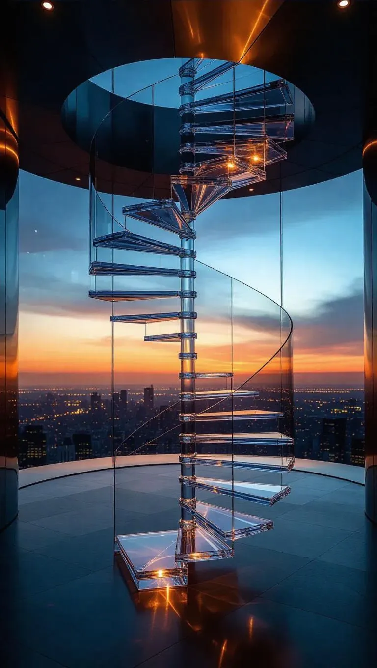 A spiraling staircase crafted from frosted glass and shimmering ice crystals, ascending into a vast, twilight sky, illuminated by soft, warm light, creating a magical and otherworldly atmosphere