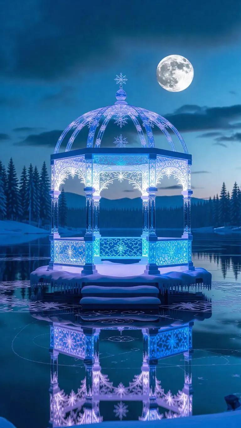 A mystical ice crystal gazebo resting gracefully on a lively frozen lake, shimmering under the gentle moonlight, with intricate frost patterns adorning the ice, creating a magical winter wonderland.