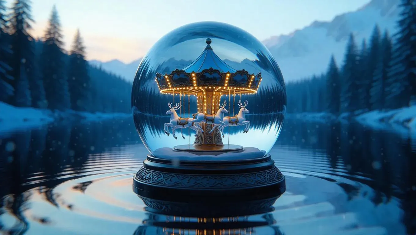 A magical snow globe encasing a spinning carousel crafted from brilliant glass stag and soft twilight lights, set against a misty lake backdrop with soft ripples, evoking a sense of calm and reflection