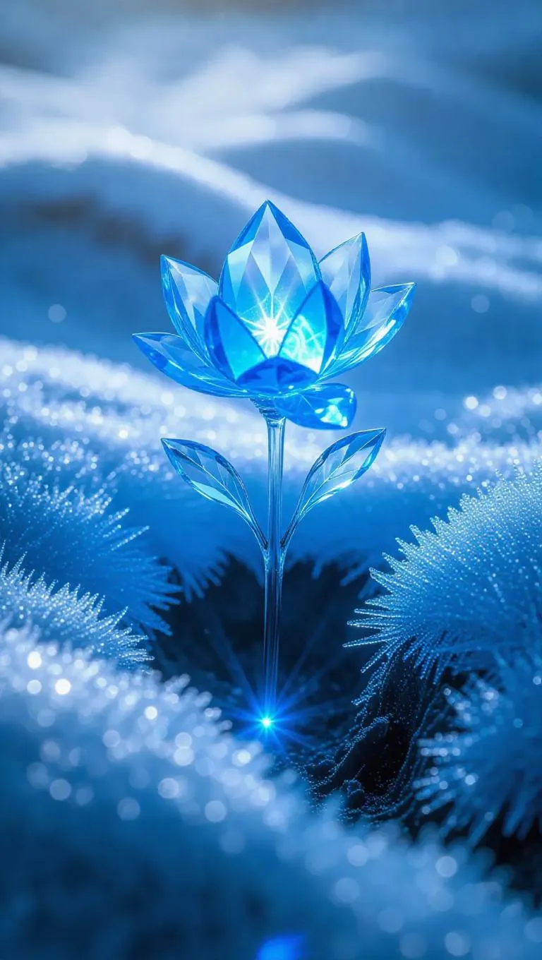 A single ethereal blue crystal flower emerging from a fissure in the icy ground, surrounded by delicate, swirling flurries. The flower radiates a bright glow, casting a magical aura over the frosty landscape