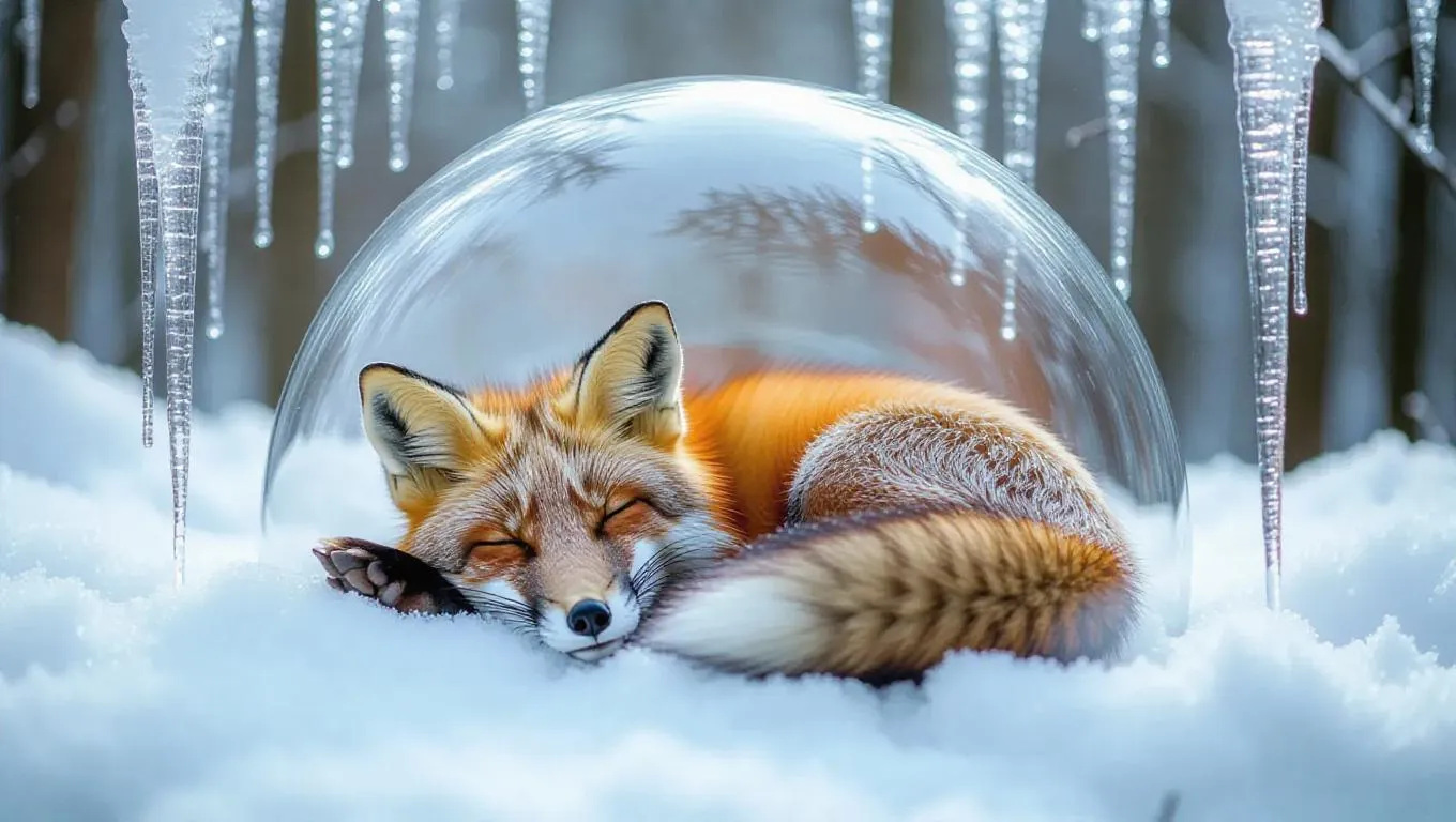 A sleeping fox curled inside a translucent crystal dome, surrounded by glistening icicles and soft, fluffy snow, creating a magical, winter wonderland atmosphere