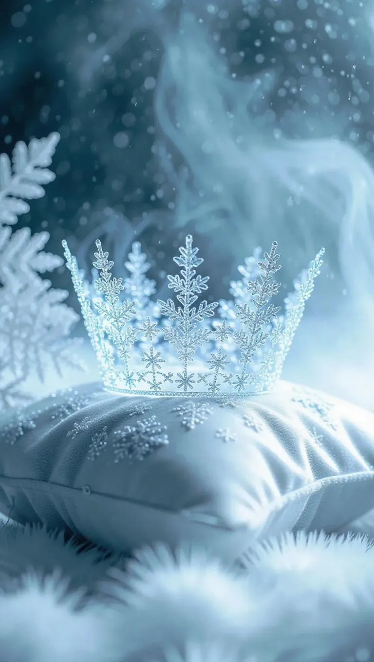 A delicate crown crafted from intricate snowflakes and shimmering icy crystals, gently resting on a plush pillow of glimmering ice, surrounded by a frosty mist that adds a magical aura to the scene