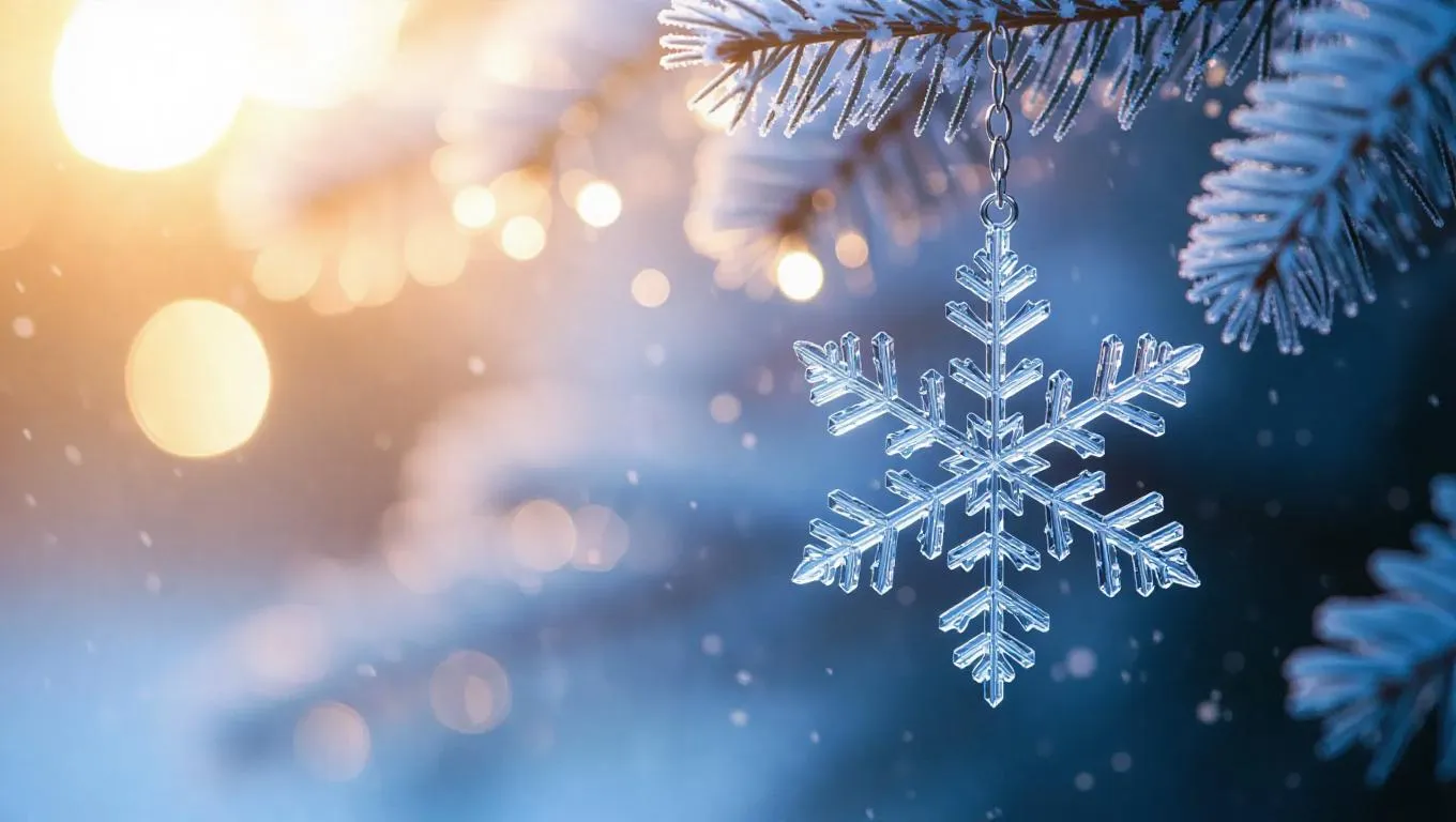 A delicate snowflake close-up, formed entirely from intricate crystal patterns, hanging from a delicate chain, illuminated by soft, ethereal light, with a frosty, shimmering glow, capturing the essence of winter's beauty