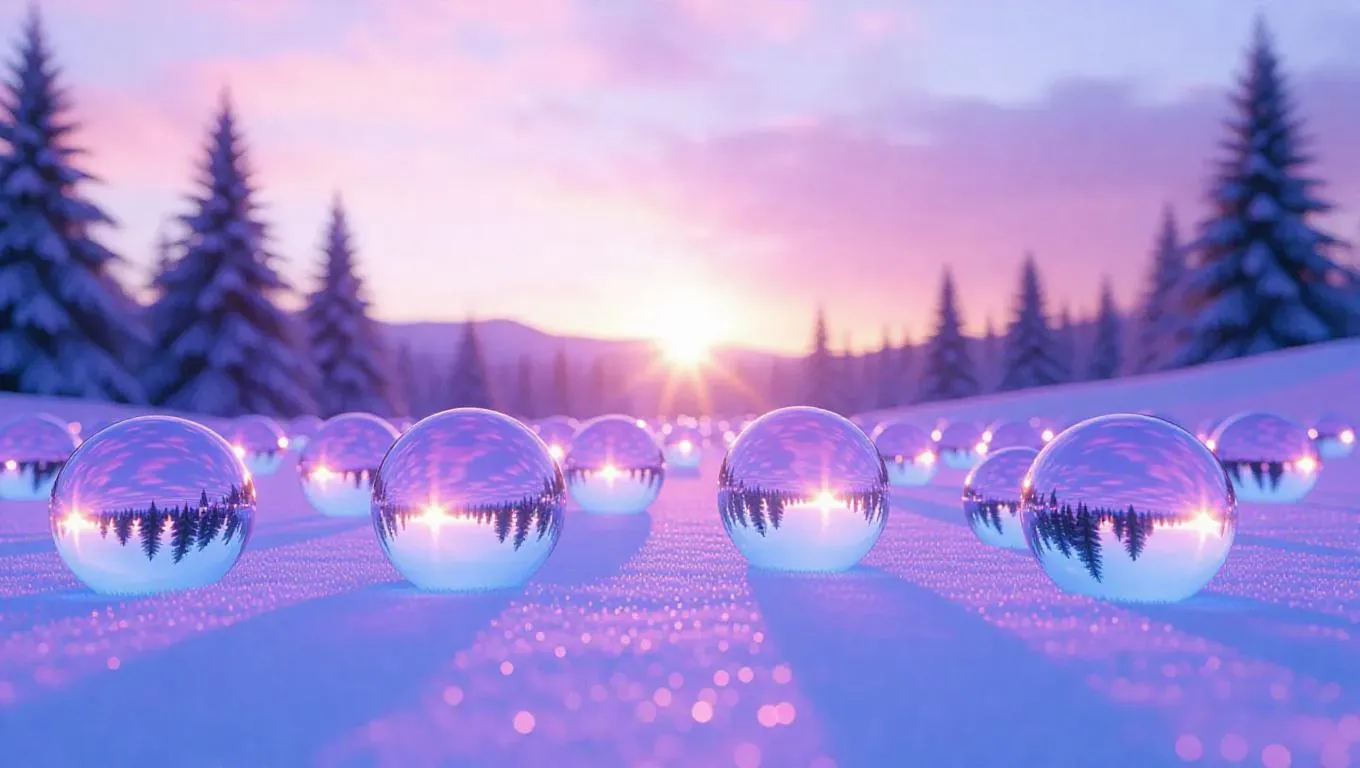 A vast snowy field adorned with scattered floating crystal orbs, each orb shimmering and reflecting the colors of dawn in a unique, vibrant hue, creating a mesmerizing, otherworldly landscape