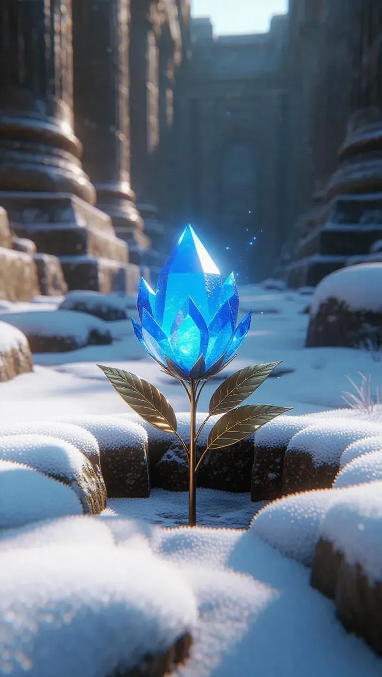 A single ethereal blue crystal flower emerging from a fissure in the sandy ground, encircled by delicate, golden leaves. The flower radiates a subtle glow, casting a magical aura over the frosty ruins of an ancient temple, where icy pillars rise from the snow-covered floor.