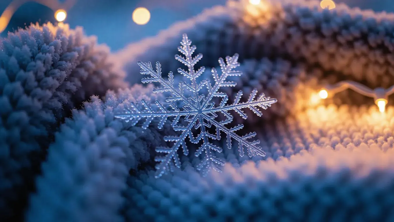 A delicate snowflake close-up, formed entirely from intricate crystal patterns, resting on a cozy blanket, illuminated by soft, ethereal light, with a frosty, shimmering glow, capturing the essence of winter's beauty