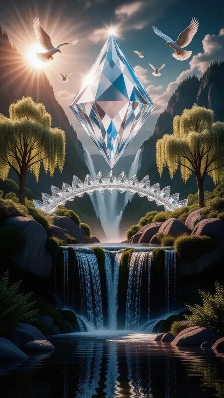 A diamond-spired tower floats above a waterfall that mirrors a single sun—a glowing orb. Crystalline eagles soar above cascading waters, while mirrored linden trees bear fruit like whispering desires, and a suspended crystal bridge hums between dimensions.
