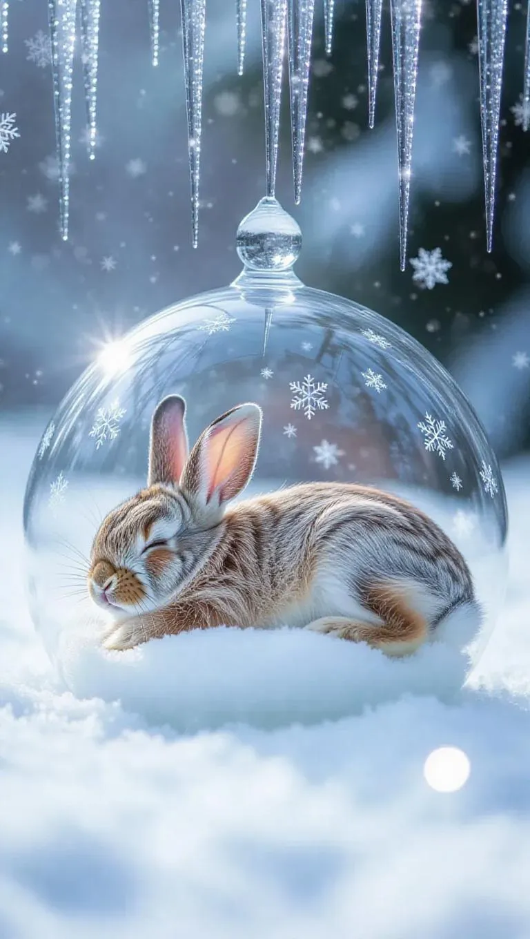 A sleeping rabbit curled inside a translucent crystal dome, surrounded by glistening icicles and fluffy snowflakes, creating a magical, winter wonderland atmosphere in a frosty meadow.