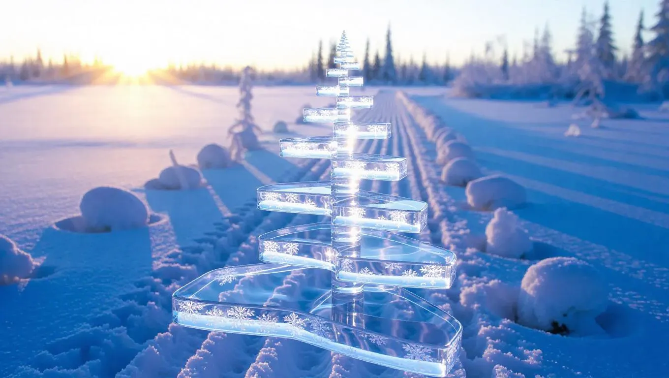 A crystalline staircase spirals while crystallizing new frost-veined steps, each tread blooming delicate ice patterns that change with temperature. The ethereal recliner exhales aurora particles, its cold glow revealing ancient snowy legends across the tundra. Every blizzard snowflake carries miniature frost bungalows, while background gusts approach in perpetual slow motion yet never arrive.