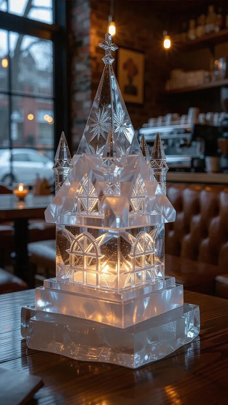 A delicate fairy monument crafted from intricately carved ice, featuring glowing crystal windows that shimmer with ethereal light, nestled in a quiet coffee shop, surrounded by cozy furniture and the aroma of fresh brew.