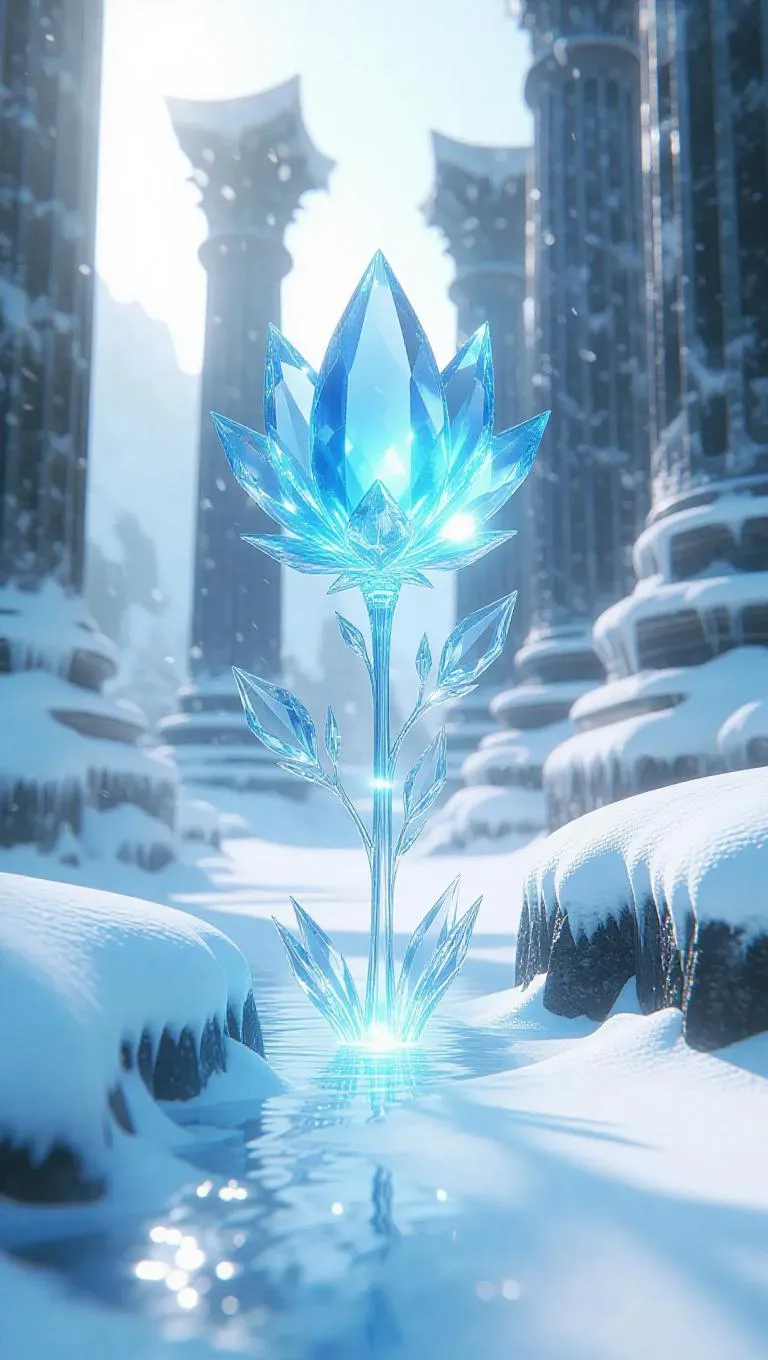 A single ethereal blue crystal flower emerging from a fissure in the icy ground, encircled by delicate, sharp icicles. The flower radiates a bright glow, casting a magical aura over the frosty ruins of an ancient temple, where snowy pillars rise from the snow-covered floor.