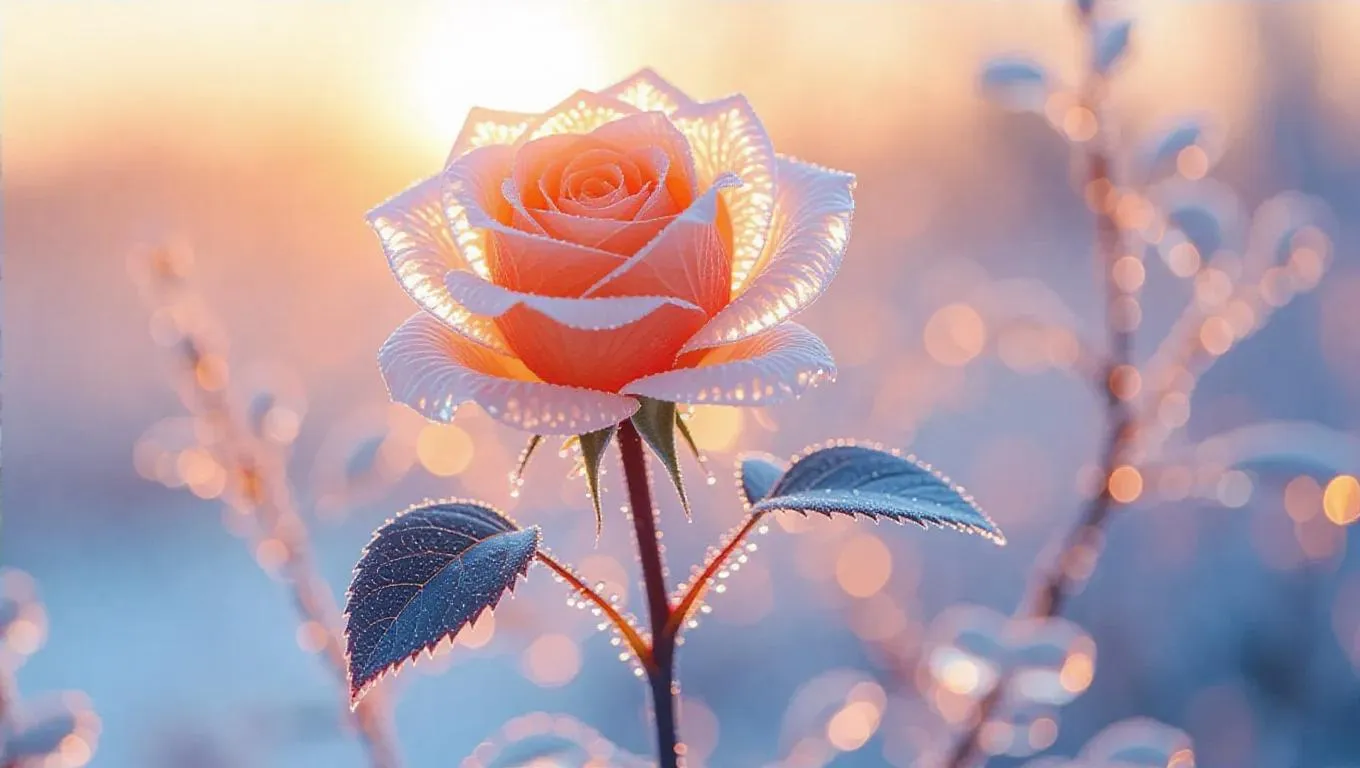 A frozen rose bush, each bloom crafted from glassy crystal, sparkling brilliantly in the sunlight, surrounded by a frosty mist that adds an ethereal glow, set against a backdrop of glowing embers and a dusky orange sky
