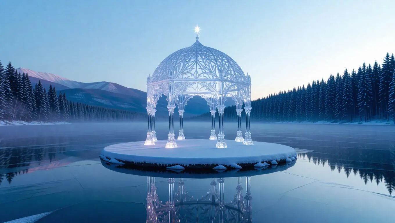 A mystical ice crystal gazebo resting majestically on a serene frozen lake, shimmering under the clear starlight, with fascinating frost patterns adorning the ice, creating a spellbinding winter landscape.
