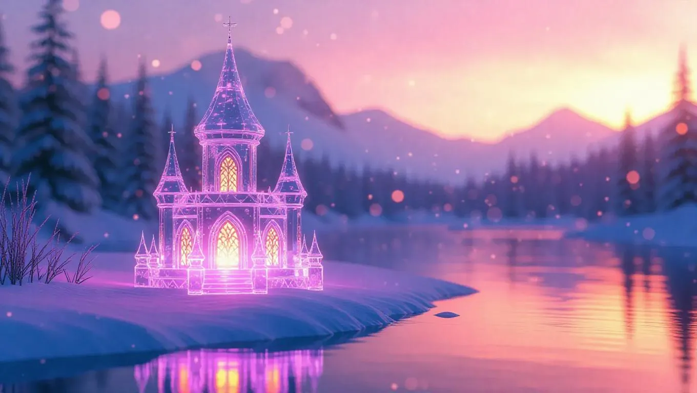 A delicate fairy tower crafted from intricately carved ice, featuring glowing crystal windows that shimmer with ethereal light, nestled in a brilliant aurora-lit landscape, surrounded by dancing lights and icy reflections.