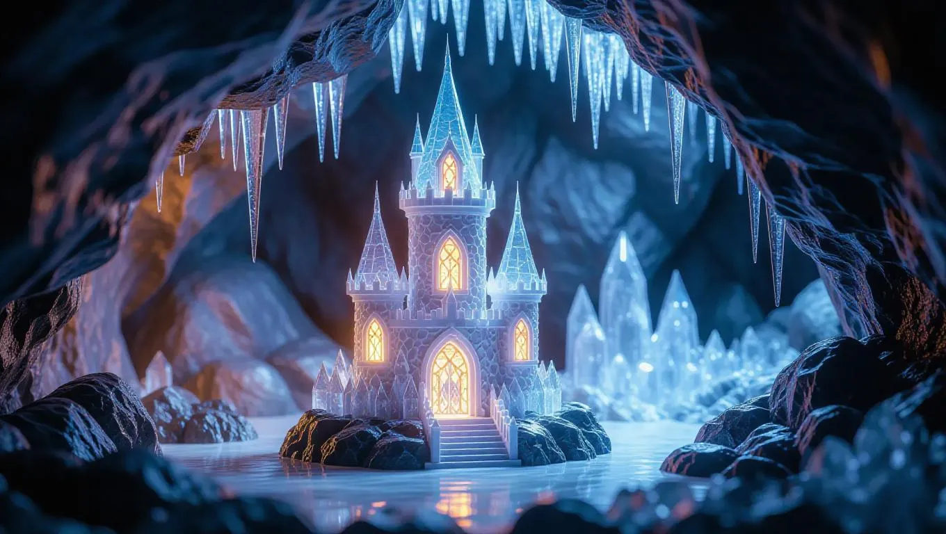 A delicate fairy tower crafted from intricately carved ice, featuring glowing crystal windows that shimmer with ethereal light, nestled in a mystical crystal cave, surrounded by gleaming rocks and shimmering stalactites.