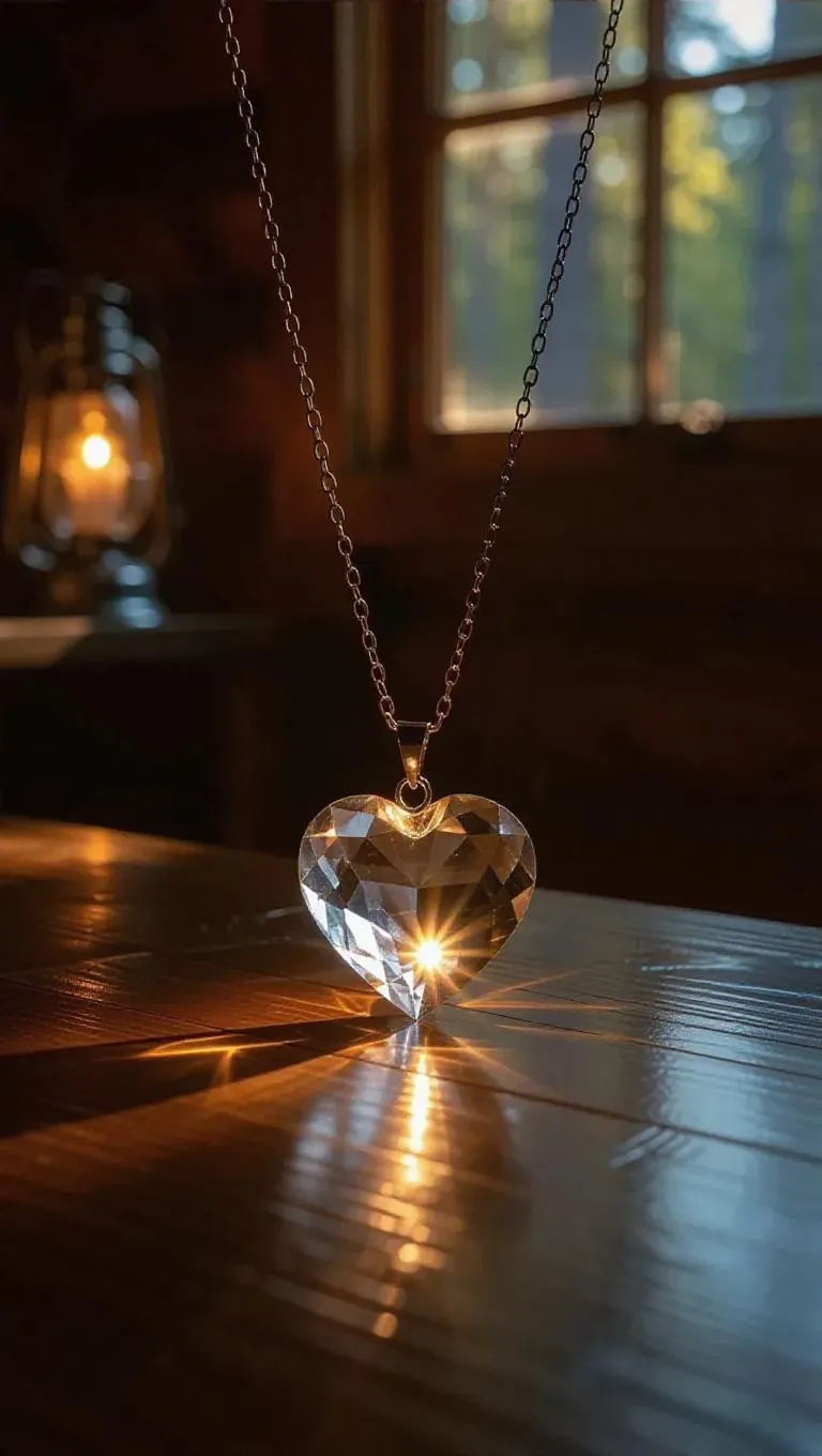 A heart-shaped crystal pendant, resting delicately on a dark wooden table, glowing faintly with an ethereal inner light, casting soft, shimmering reflections on the polished surface, surrounded by a cozy, rustic cabin