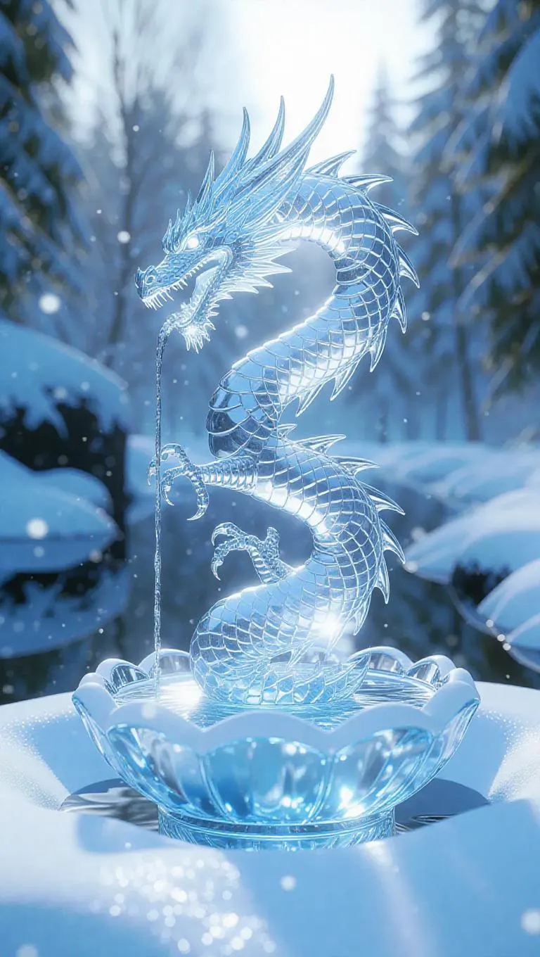 A majestic frozen fountain shaped like a dragon, water suspended mid-motion in clear crystal curves, surrounded by a blanket of snow, with soft, diffused light casting a magical glow, emphasizing the intricate ice formations against a backdrop of a serene frosty ravine.
