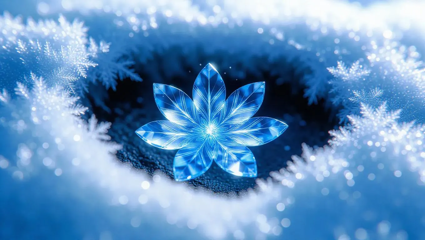 A single ethereal blue crystal flower emerging from a fissure in the icy terrain, encircled by delicate, pristine snowflakes. The flower radiates a gentle glow, casting a magical aura over the frosty landscape