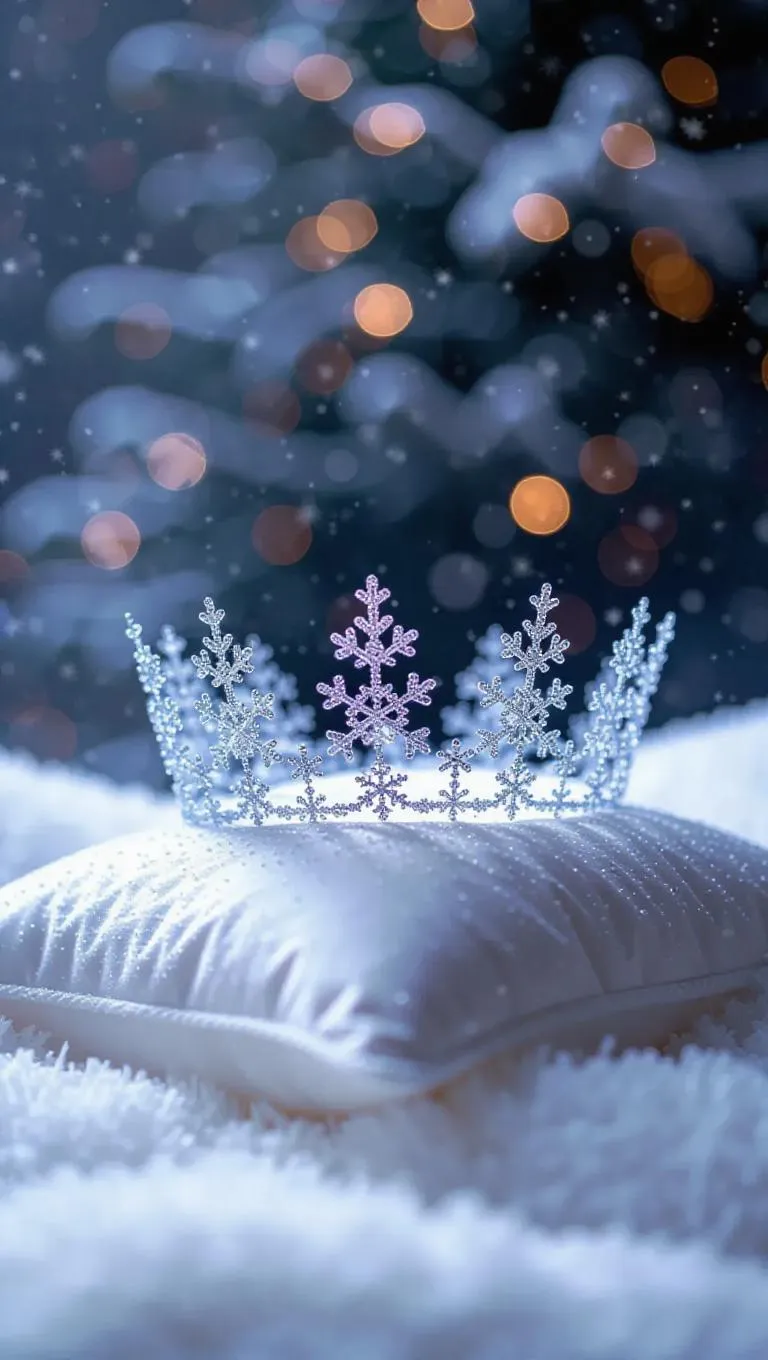 A delicate crown crafted from intricate snowflakes and sparkling icy crystals, gently resting on a plush pillow of pristine snow, surrounded by a shimmering mist that adds a magical aura to the scene