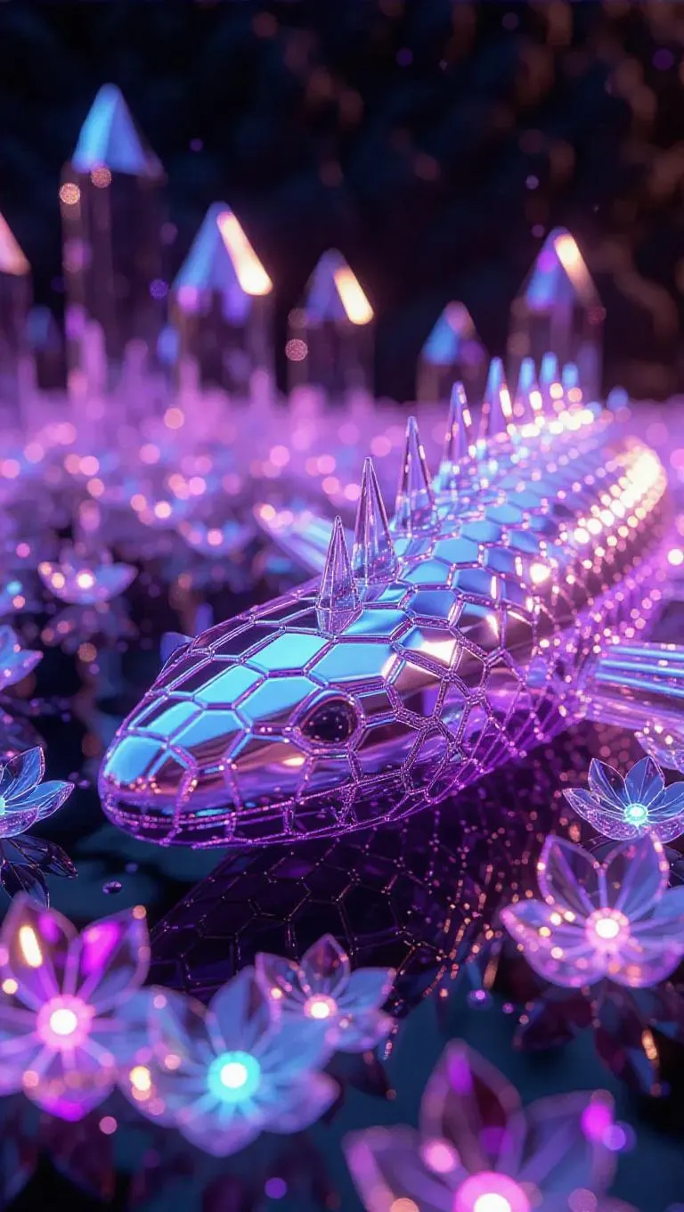 A horizon of airborne crystal structures stretches over a vast, shimmering gem plain, where a sleeping creature of glass and astral dust lies, its scales highlighted with ancient constellations—while above, gem-flowers float like bright prisms in a gentle breeze that whispers through glass, creating a serene and magical atmosphere in this sparkling realm.