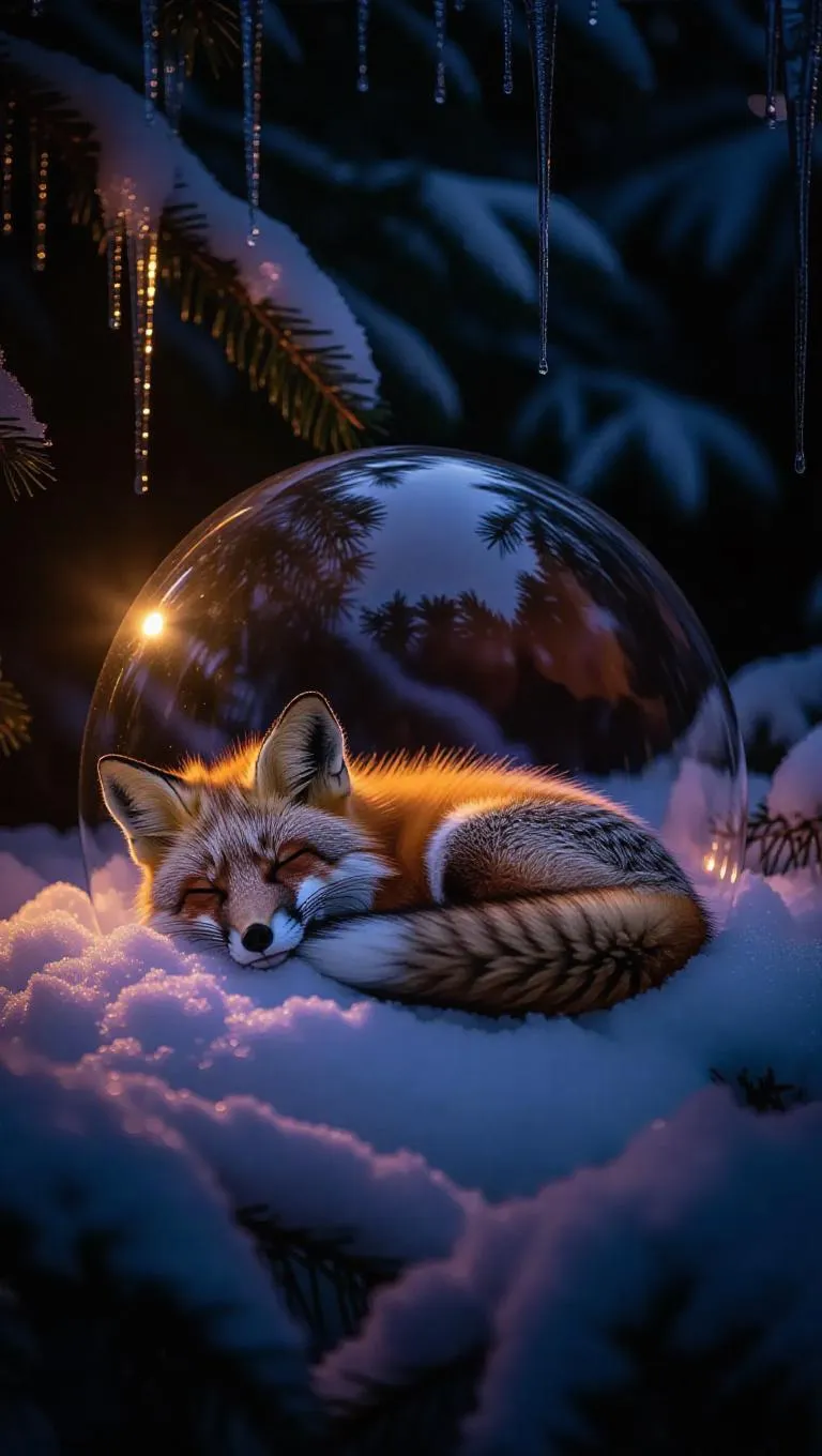 A sleeping fox curled inside a translucent crystal dome, surrounded by vibrant icicles and soft, fluffy snow, creating a magical, winter wonderland atmosphere