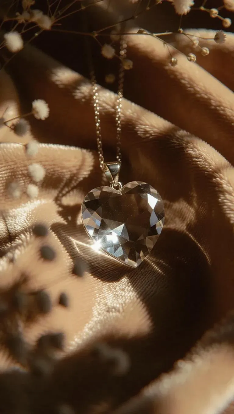 A heart-shaped crystal pendant, resting delicately on a soft velvet cloth, glowing faintly with an ethereal inner light, casting soft, shimmering reflections on the fabric, surrounded by a serene, elegant parlor