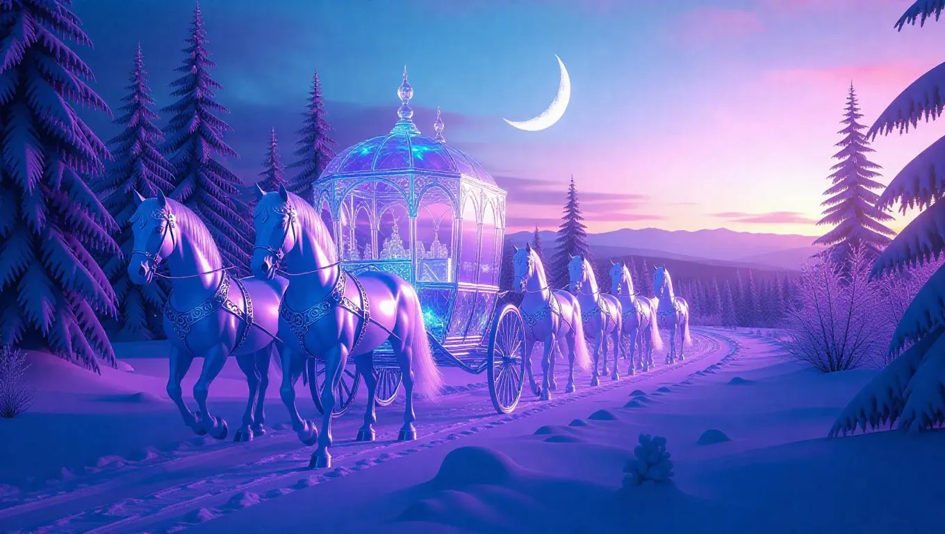 A dreamlike crystal carriage, shimmering with iridescent hues, pulled by ethereal ice horses, set on a snowy trail under a vibrant sky, with frosty trees and a crescent moon adding a magical glow