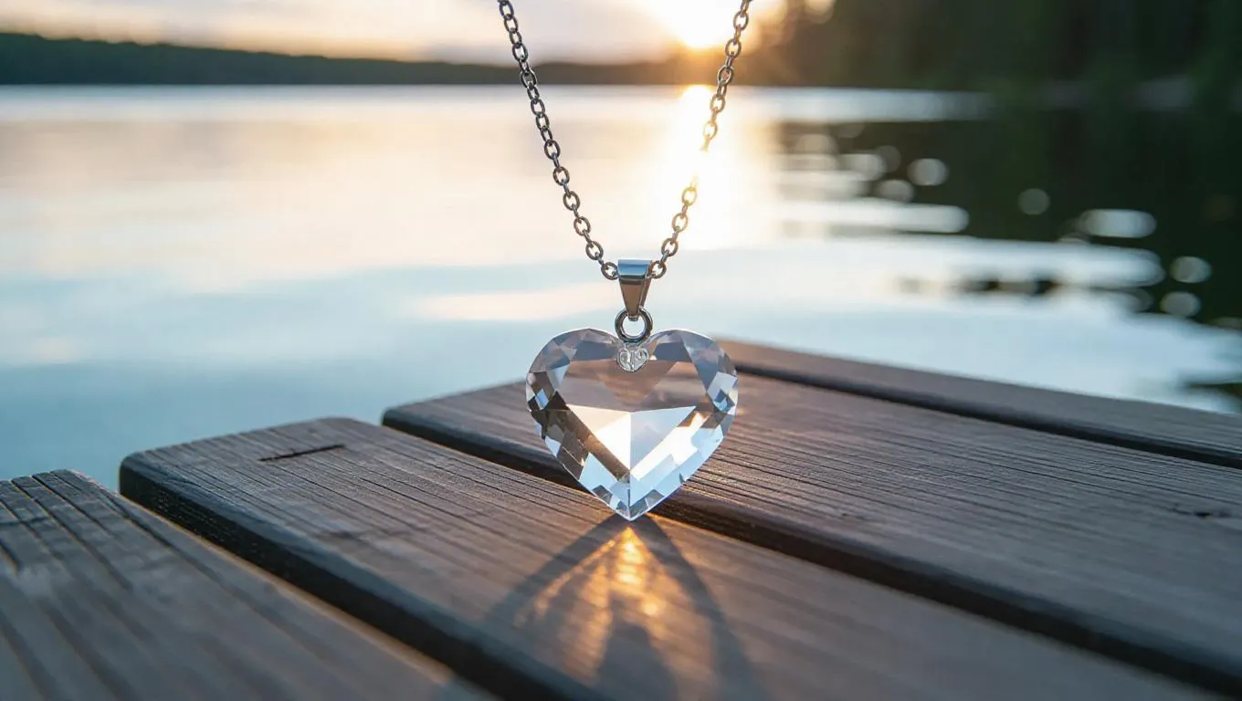 A heart-shaped crystal pendant, resting delicately on a weathered wooden dock, glowing faintly with an ethereal inner light, casting soft, shimmering reflections on the water beneath, surrounded by a serene, lakeside view