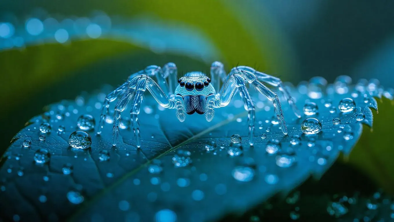 A delicate crystal spider perched on a frosted leaf, legs crafted from transparent ice with intricate, shimmering patterns, glowing softly in the gentle morning light, surrounded by dewdrops that sparkle like diamonds on a lush jungle floor.