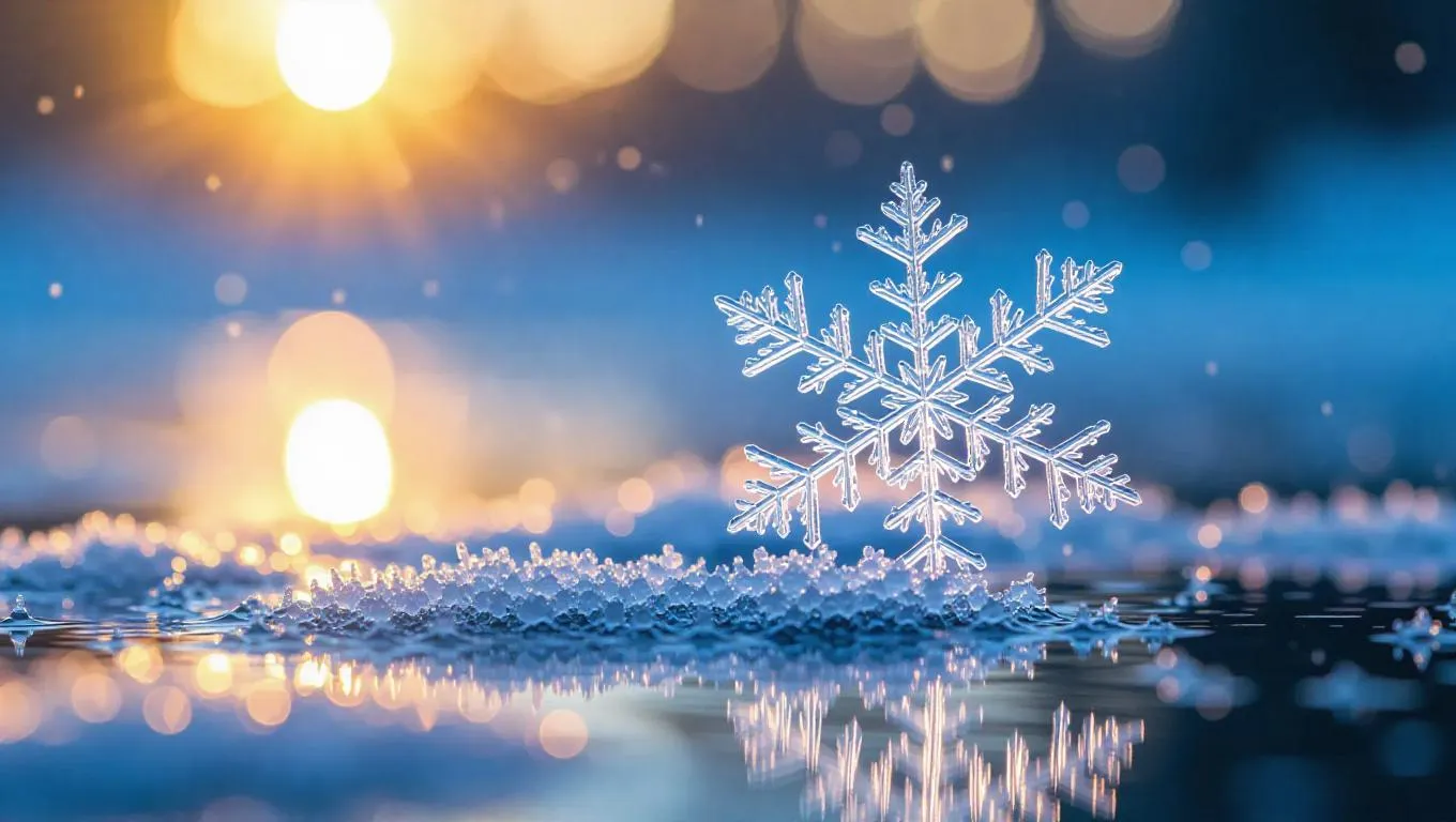 A delicate snowflake close-up, formed entirely from intricate crystal patterns, shining on a frozen lake, illuminated by soft, ethereal light, with a frosty, shimmering glow, capturing the essence of winter's beauty