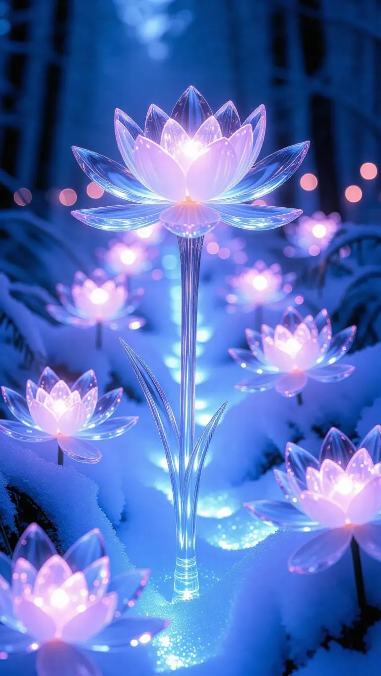 A mystical path adorned with glowing ice lilies blooming in the snow, petals crafted from translucent frosted crystal, casting ethereal light and shimmering hues, creating a enchanting winter wonderland