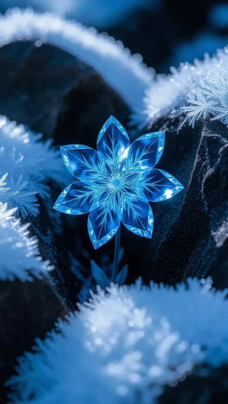 A single ethereal blue crystal flower emerging from a fissure in the rocky ground, encircled by delicate, pristine snowflakes. The flower radiates a subtle glow, casting a magical aura over the frosty landscape