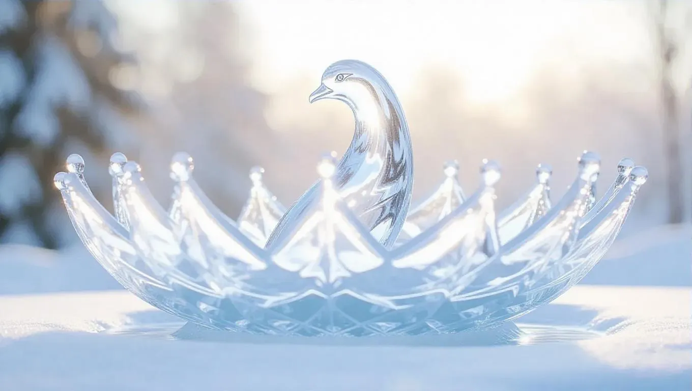 A majestic frozen fountain shaped like a bird, water suspended mid-motion in clear crystal curves, surrounded by a blanket of snow, with soft, diffused light casting a magical glow, emphasizing the intricate ice formations