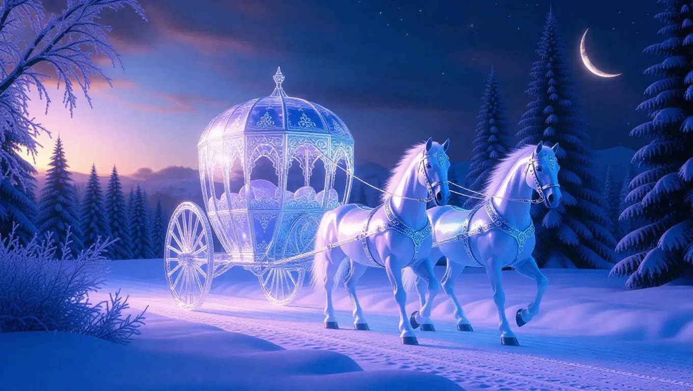 A dreamlike crystal carriage, shimmering with iridescent hues, pulled by ethereal ice horses, set on a snowy trail under a magical sky, with frosty trees and a crescent moon adding a warm glow