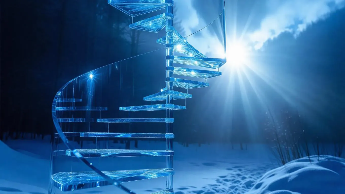 A spiraling staircase crafted from frosted glass and sparkling ice crystals, ascending into a vast, snowy sky, illuminated by soft, ethereal light, creating a magical and otherworldly atmosphere