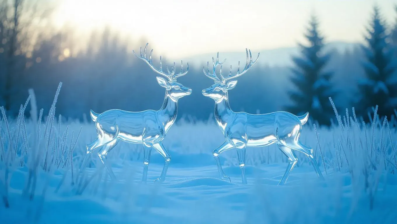 A pair of ethereal crystal deer gracefully walking through a serene icy meadow covered in fresh snow, their translucent bodies shimmering as they catch the soft rays of the morning sun, creating a magical and frosty ambiance