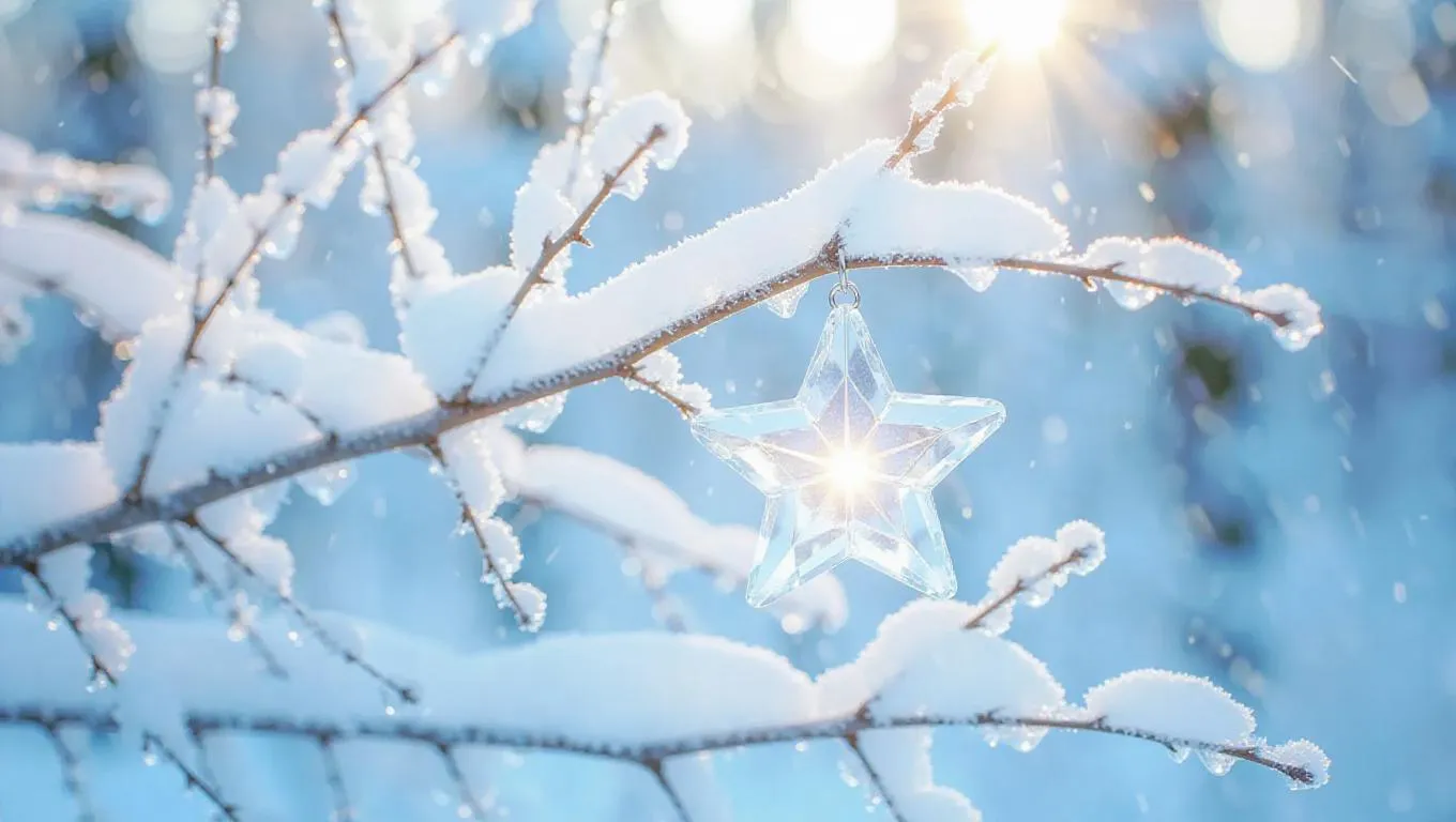 A star-shaped crystal pendant, resting delicately on the frost-covered branches of a winter forest, glowing faintly with an ethereal inner light, casting soft, shimmering reflections on the icy twigs, surrounded by a serene, snowy woodland.