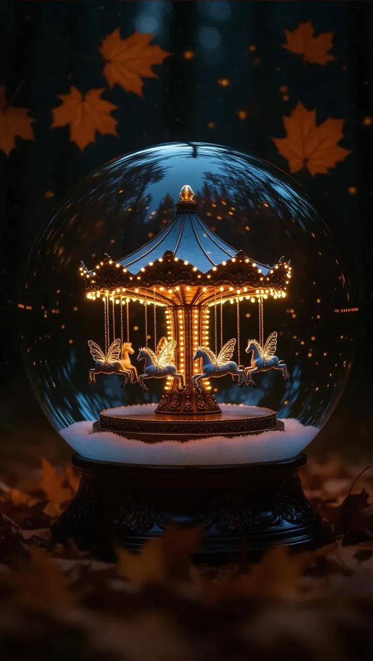 A magical snow globe encasing a spinning carousel crafted from shining glass fairies and glowing autumn lights, set against a dark forest backdrop with falling leaves, evoking a sense of mystery and enchantment