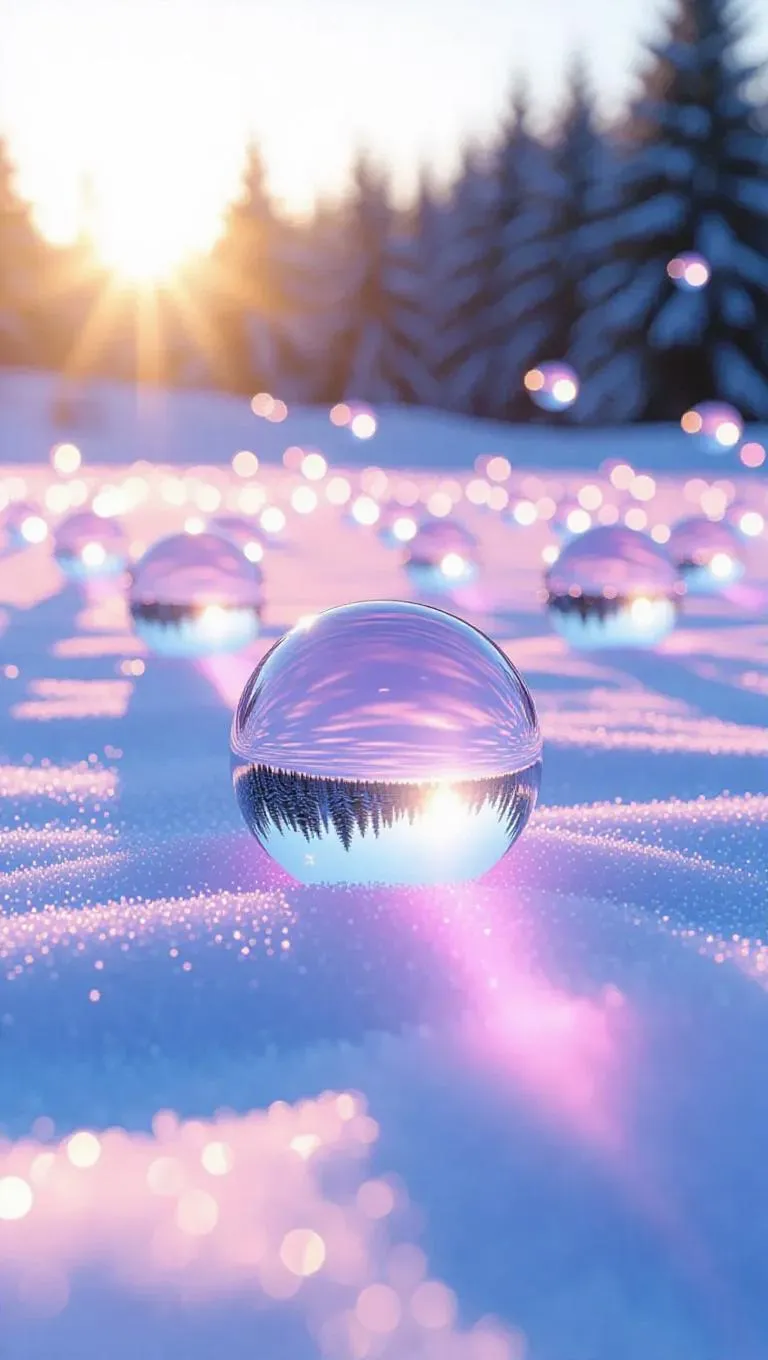 A vast snowy field adorned with scattered floating crystal orbs, each orb shimmering and reflecting the sun in a unique, vibrant hue, creating a mesmerizing, otherworldly landscape