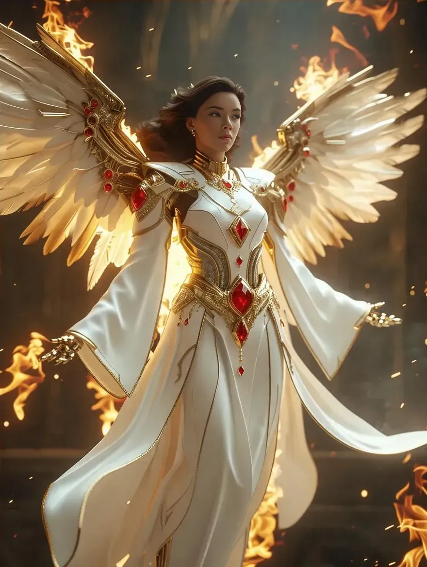 Generate ultra-realistic AI character designs with cinematic flair. Craft futuristic Lovecraftian robot angels featuring fire wings, floating poses, white robes with red accents, and intricate ruby-gold jewelry. Ideal for professional-grade visuals, cinematic effects, and detailed AI art. Perfect for concept design, fantasy storytelling, and high-impact visuals powered by Vivago.ai's advanced AI image generator.