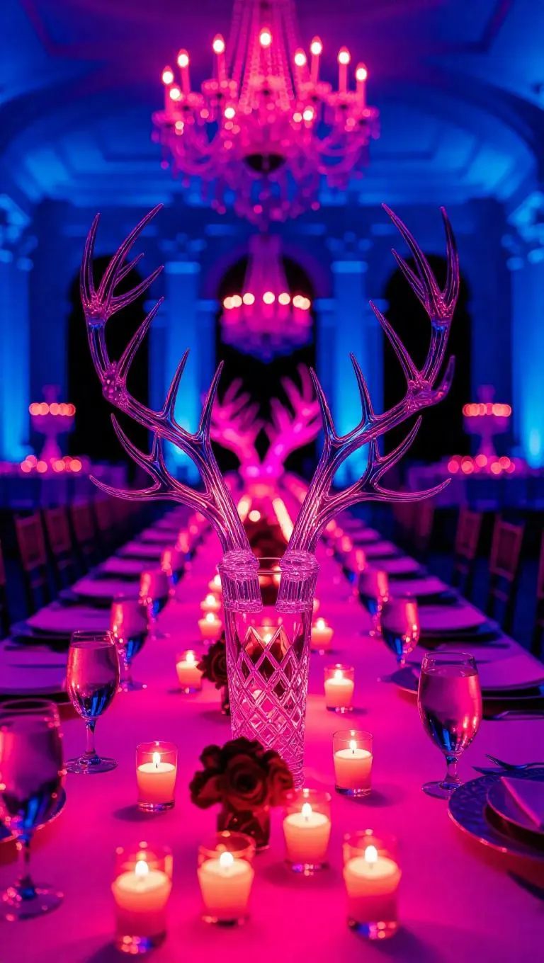 A pair of intricate crystal antlers, gracefully appearing on a lavish banquet table in a frozen ballroom, glowing with a stunning berry light, surrounded by elegant dishes and glistening cutlery, creating a sophisticated and inviting atmosphere, set in a grand venue with exceptional decor and ice-carved centerpieces.