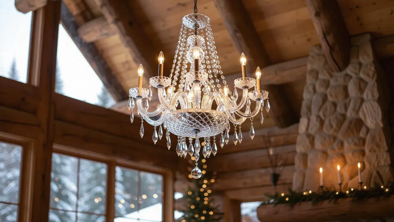 An elegant chandelier crafted entirely from shimmering ice crystals, suspended in a rustic lodge with wooden beams and stone walls, reflecting a mesmerizing array of light and shadows, creating an ethereal, frosty aura in the winter gathering space.