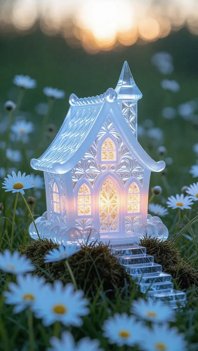 A delicate fairy house crafted from intricately carved ice, featuring glowing crystal windows that shimmer with ethereal light, nestled in a tranquil spring meadow, surrounded by blooming flowers and gentle breezes
