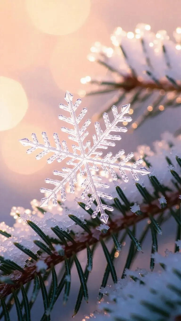 A delicate snowflake close-up, formed entirely from intricate crystal patterns, resting on a pine needle, illuminated by soft, ethereal light, with a frosty, shimmering glow, capturing the essence of winter's beauty