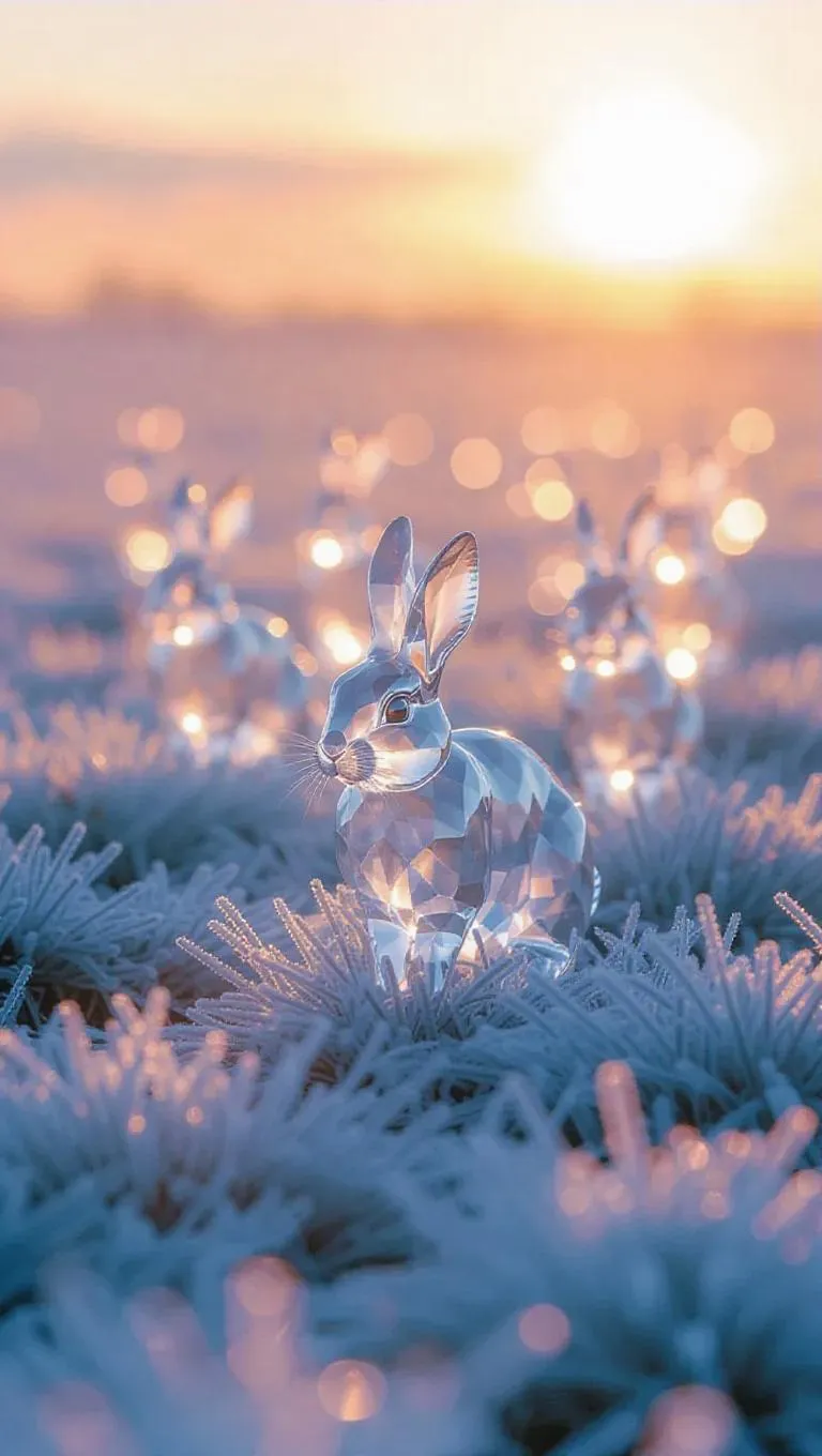 A group of ethereal crystal rabbits gracefully walking through a serene icy field, their translucent bodies shimmering as they catch the soft rays of the sunrise, creating a magical and frosty ambiance.