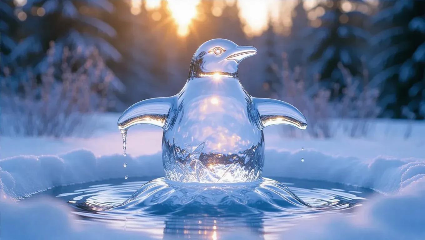 A majestic frozen fountain shaped like a penguin, water suspended mid-motion in clear crystal curves, surrounded by a blanket of snow, with soft, diffused light casting a magical glow, emphasizing the intricate ice formations