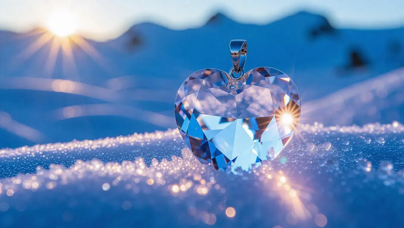 A heart-shaped crystal pendant, resting delicately on a blanket of ice, glowing faintly with an ethereal inner light, casting soft, shimmering reflections on the frosty surface, surrounded by a serene, arctic vista